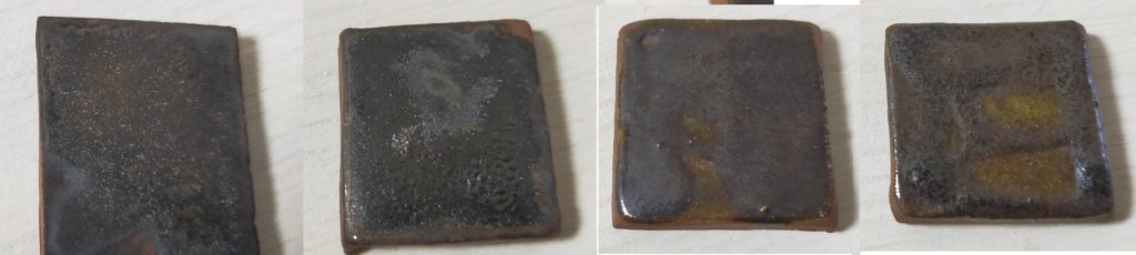 これまですべて平置きでのテストピースで行ってきたが、立てて焼くとまた違った結果になると思われる。釉が流れるときに金色の発色がより強くなるらしい。